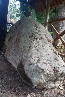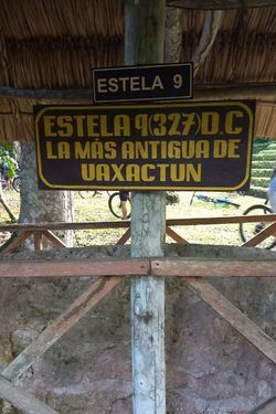 Gran recibimiento el que te da Uaxactún, porque llevas poco tiempo de estar caminando, escuchando aves, ver gran cantidad de árboles gigantes y bajo uno de los ranchitos que resguardan del sol y la lluvia a las estelas, aparece la estela más antigua de Uaxactún.